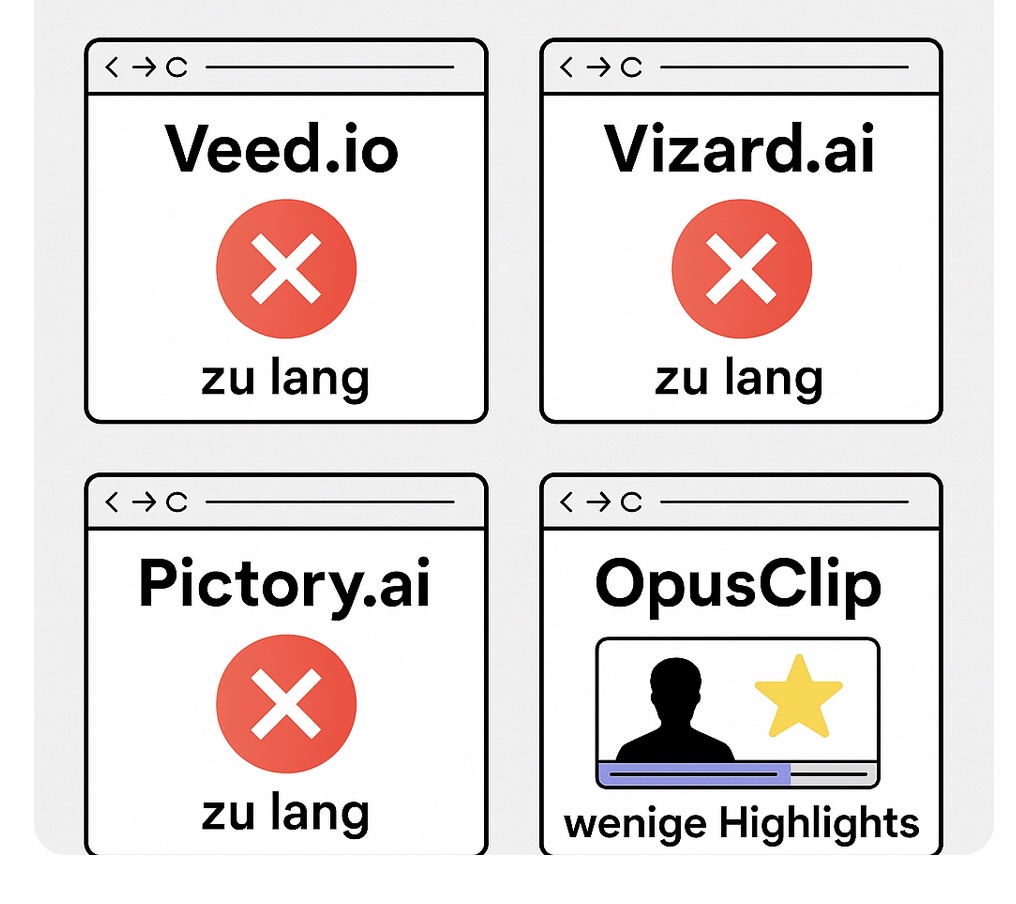 Mit KI Tools Social Media Videos bearbeiten, kürzen, untertiteln - Veed.io, Vizard.ai, Pictory.ai und OpusClip – warum KI-Tools bei längeren deutschsprachigen Videos scheitern