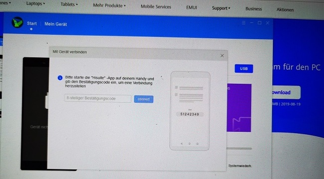 normalerweise sollte beim Anschließen des Smartphones an den Computer die HiSuite Applikation automatisch öffnen. Und damit die Daten übertragen werden können, müssen Sie in das Eingabefeld den Code eingeben, den Sie auf dem Smartphone sehen. Erst dann beginnt die Übertragung.