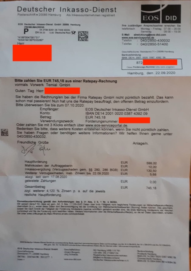 Tom hatte vom Inkassobüro mit Datum 22. September 2020 folgendes Schreiben erhalten: "Bitte zahlen Sie EUR 745,18 aus einer Ratepay-Rechnung vormals Vorwerk Temial GmbH. Guten Tag Herr Sch., Sie haben die Rechnung/en bei der Firma Ratepay GmbH nicht pünktlich bezahlt. Das kann schon mal passieren! Nun hat uns die Ratepay beauftragt, den offenen Betrag einzufordern. Bitte überweisen Sie bis zum 07.10.2020…. 745,18 Euro. .. Bedenken Sie, dass weitere Kosten entstehen können, wenn Sie nicht pünktlich zahlen. Sie haben Fragen oder benötigen weitere Informationen? Wir helfen Ihnen gerne unter 040/2850-430032."