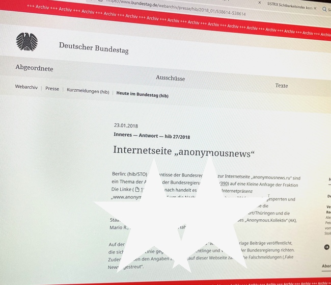 In einer Antwort der Bundesregierung auf eine Kleine Anfrage der Fraktion "Die Linke", veröffentlicht auf bundestag.de, wird die Webseite „www.anonymousnews.ru“ als Nachfolger des im Februar 2016 gesperrten und im Mai 2016 wohl auf Zensur-Betreiben der deutschen Regierung oder von Behörden betriebene Löschung des Facebook-Profils „Anonymous.Kollektiv“ dargestellt.