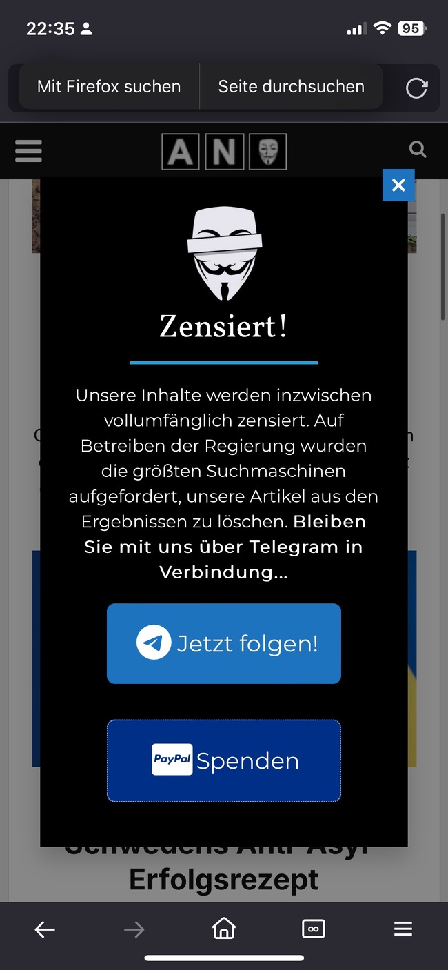 Anonymousnews erhebt in diesem Kontext schwere Vorwürfe gegen die deutsche Bundesregierung und indirekt, darf man wohl annehmen, damit auch gegen bundestag.de. Das Portal behauptet, dass die Regierung große Suchmaschinen wie Google angewiesen habe, die Sichtbarkeit ihrer Artikel zu reduzieren oder sie komplett aus den Suchergebnissen zu entfernen. Ein Banner auf ihrer mobilen Website behauptet: "Zensiert! Unsere Inhalte werden inzwischen vollumfänglich zensiert. Auf Betreiben der Regierung wurden die größten Suchmaschinen aufgefordert, unsere Artikel aus den Ergebnissen zu löschen. Bleiben Sie mit uns über Telegram in Verbindung. Jetzt folgen. Paypal. Spenden." Diese drastischen Aussagen sollen nicht nur Aufmerksamkeit erregen, sondern rufen auch zu Spenden auf, um sich gegen die angebliche Zensur zu wehren.