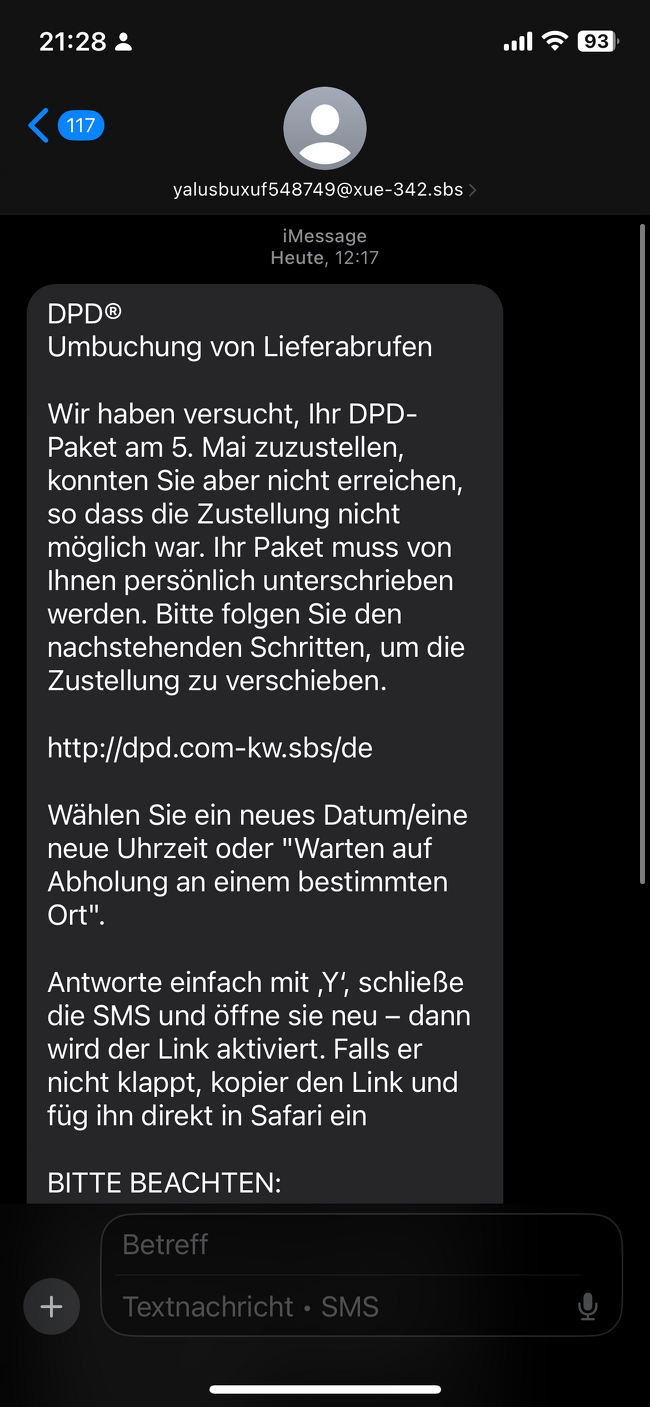Phishing-SMS im DPD-Look: yalusbuxuf548749@xue-342.sbs mit Fake-Link dpd.com-kw.sbs/de