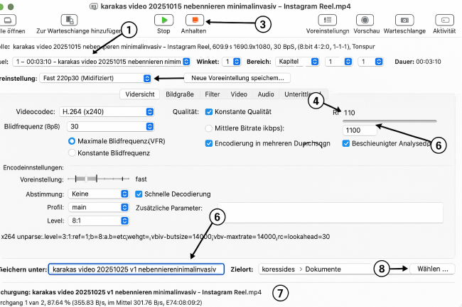 Unten rechts bleibt die Voreinstellung „fast“ aktiv, das Profil main und das Level 3.1 – diese Kombination ist optimal für Social-Media-Videos, Reels und Web-Uploads. Anschließend wird unten im Fenster unter „Speichern unter“ ein neuer Dateiname vergeben – zum Beispiel karakas_video_20251015_verkleinert.mp4 – und über „Wählen …“ ein Zielordner bestimmt. Danach genügt ein Klick auf den grünen Pfeil „Start“, und HandBrake beginnt mit der Kompression.