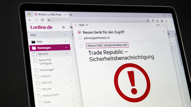Kunden mit t-online.de-Postfach werden derzeit von gleich mehreren Phishing-Mails im Namen von Trade Republic attackiert. In den Postfächern tauchen unter anderem angebliche Sicherheitsbenachrichtigungen mit den Absenderangaben „admin@petfontein.nl“ und im technischen Rückpfad „info@merhaba.com“ auf, die über ein angebliches „neues Gerät für den Zugriff“ informieren und massiv verunsichern sollen.​