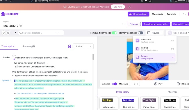Pictory will ein „All-in-one“ Tool sein: Video hochladen, Sprecher erkennen, Transkript erzeugen, daraus einen Summary-Clip generieren oder im Customize-/AI-Editor weiterbearbeiten, dazu Text-Styles und Branding. Das klingt nach einem typischen Workflow für Kommunikationsabteilungen und Creator, die täglich Reels bauen: O-Ton rein, KI macht den Schnitt, Captions drauf, Export, fertig.