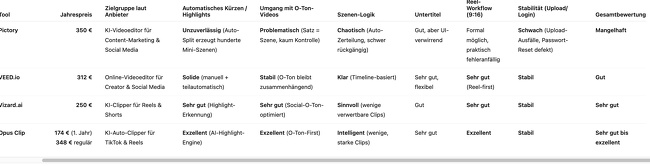 Dass Pictory in meinem Fall dabei auch noch teurer ist als VEED und Vizard und im ersten Jahr sogar oberhalb von Opus Clip liegt, macht das Gesamtbild schlechter, nicht besser. Ein Premiumpreis verlangt Premiumstabilität. Pictory liefert in meinem Test stattdessen Premiumfrust.