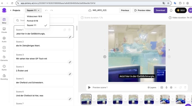 Ein Social-Tool muss beim Format glasklar sein: 9:16 für Reels/TikTok, 1:1 für Feed-Posts, 16:9 für YouTube. Pictory bietet diese Auswahl – aber im Alltag fühlt es sich an, als sei das Format nicht einheitlich projektweit durchgesetzt, sondern abhängig vom jeweiligen Modus.