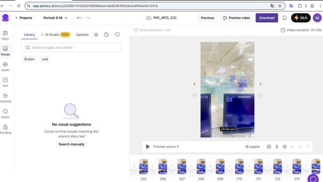 Und dann kommt das nächste Problem: Wenn man plötzlich 218 Szenen hat, ist „löschen Sie alles außer Szene 1“ keine echte Option. Das ist ein Redaktions-Albtraum. Genau hier zeigt sich, dass Pictory entweder kein tragfähiges Konzept für Social-O-Ton hat – oder die Produktentwicklung nicht sauber zwischen „Text-to-Video“-Templates und echten Video-Workflows trennt.