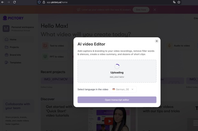 Preisvergleich (jährlich, Stand meiner Buchungen): Pictory 350 Euro p. a., VEED.io 312 Euro p. a., Vizard.ai 250 Euro p. a., Opus Clip 174 Euro im ersten Jahr (regulär 348 Euro p. a.). Wenn ein Produkt in diesem Marktsegment das Hochpreisschild trägt, dann muss es vor allem eines leisten: reibungslose Abläufe. Genau daran scheitert Pictory.