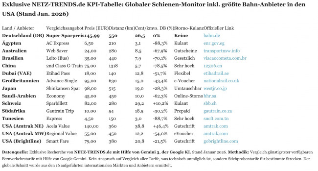 Datenquelle: Exklusive Recherche von NETZ-TRENDS.de mit Hilfe von Gemini 3, der Google KI. Stand Januar 2026. Methodik: Vergleich günstigstster verfügbaren Fernverkehrstarife mit Hilfe von Google Gemini. Kein Anspruch auf Vergleich aller Tarife, was technisch unmöglich ist, sondern Stichprobentarife für bestimmte Strecken. Der globale Schnitt wurde aus den 16 aufgeführten internationalen Märkten und Anbietern ermittelt.