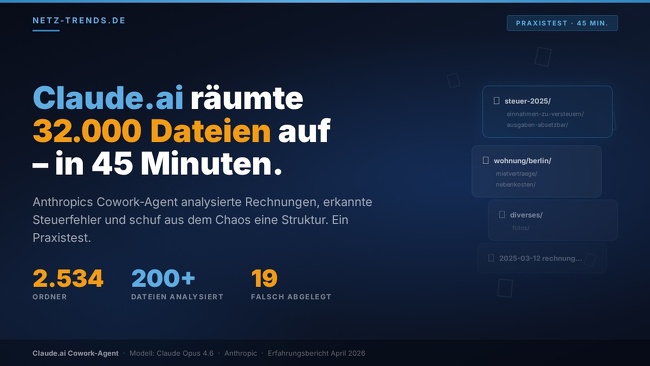 Ein Dokumentenordner mit mehr als 32.000 Dateien in über 2.500 Verzeichnissen, gewachsen über Jahre hinweg – ohne einheitliche Benennung, ohne logische Hierarchie, ohne Übersicht. Was für einen Menschen Tage oder Wochen gedauert hätte, erledigte ein KI-Agent von Anthropic (Claude.ai) in einer einzigen Sitzung. Ein Erfahrungsbericht über digitale Ordnung durch künstliche Intelligenz. Ein NETZ-TRENDS.de-Mitarbeiter/in machte den Selbsttest.